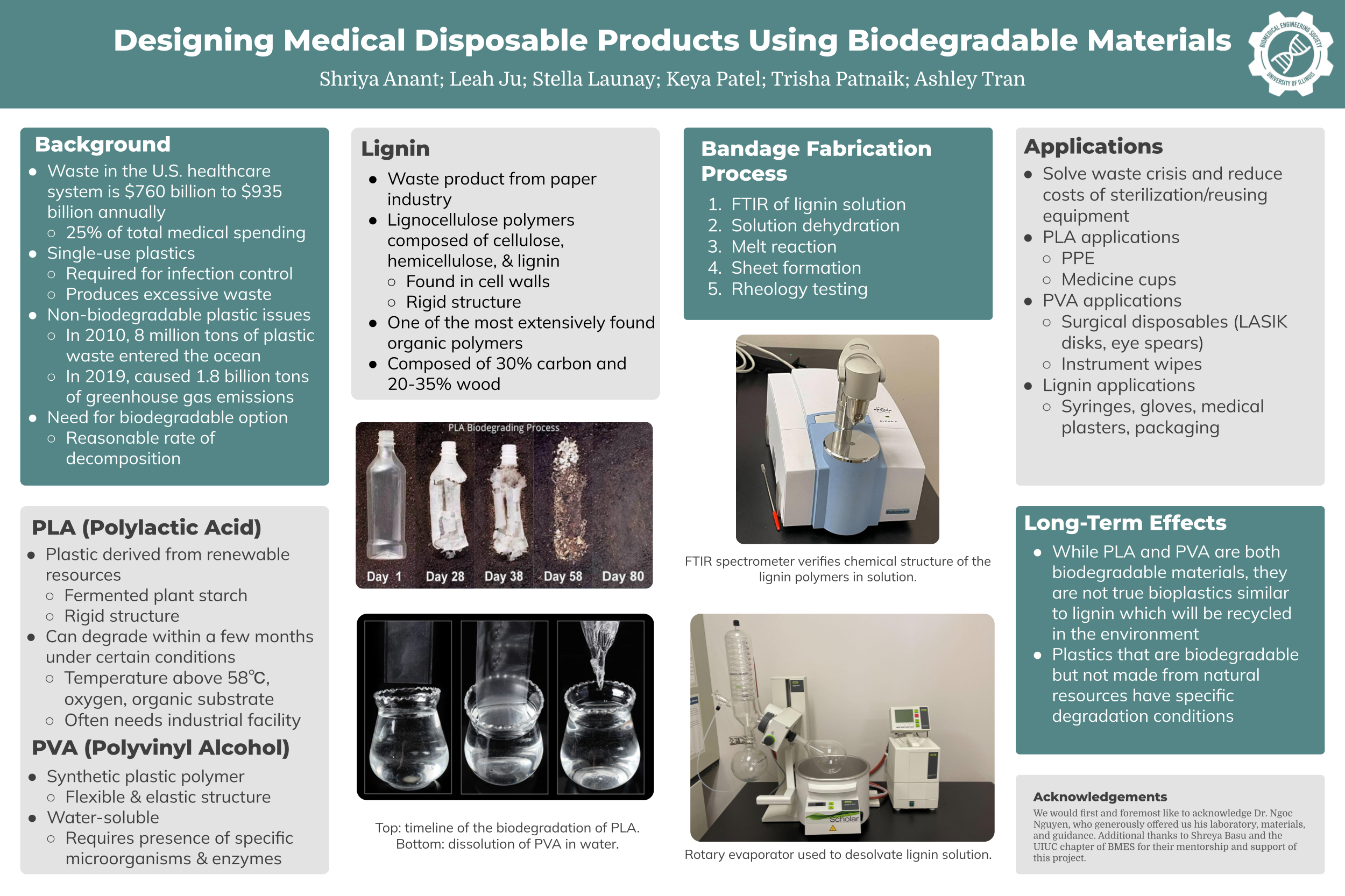 The students reached out to Dr. Ngoc Nguyen, a staff research scientist at the Illinois Applied Research Institute, whose research focuses include sustainable plastics and lignin-based materials as a substitute for oil-derived plastics.